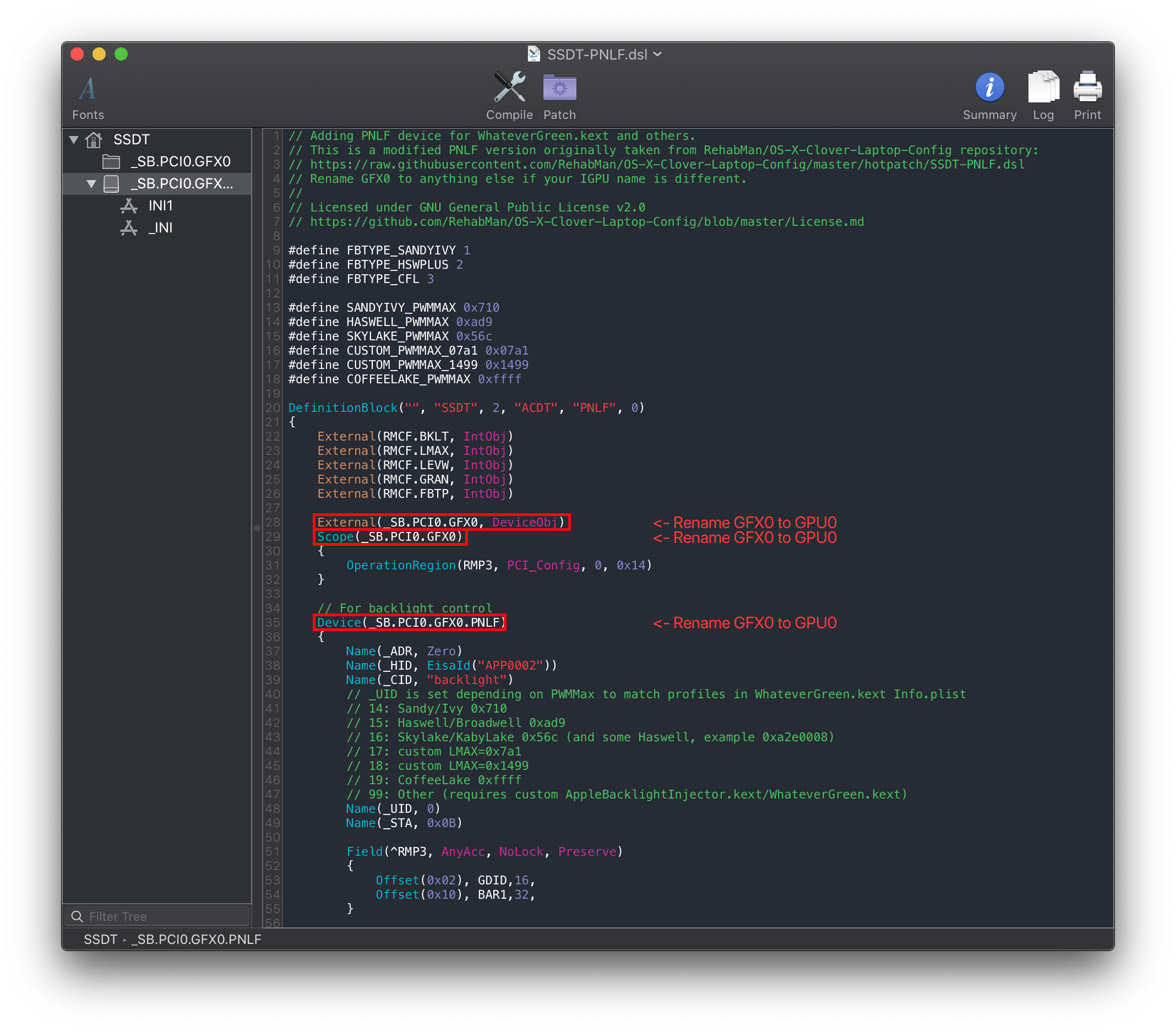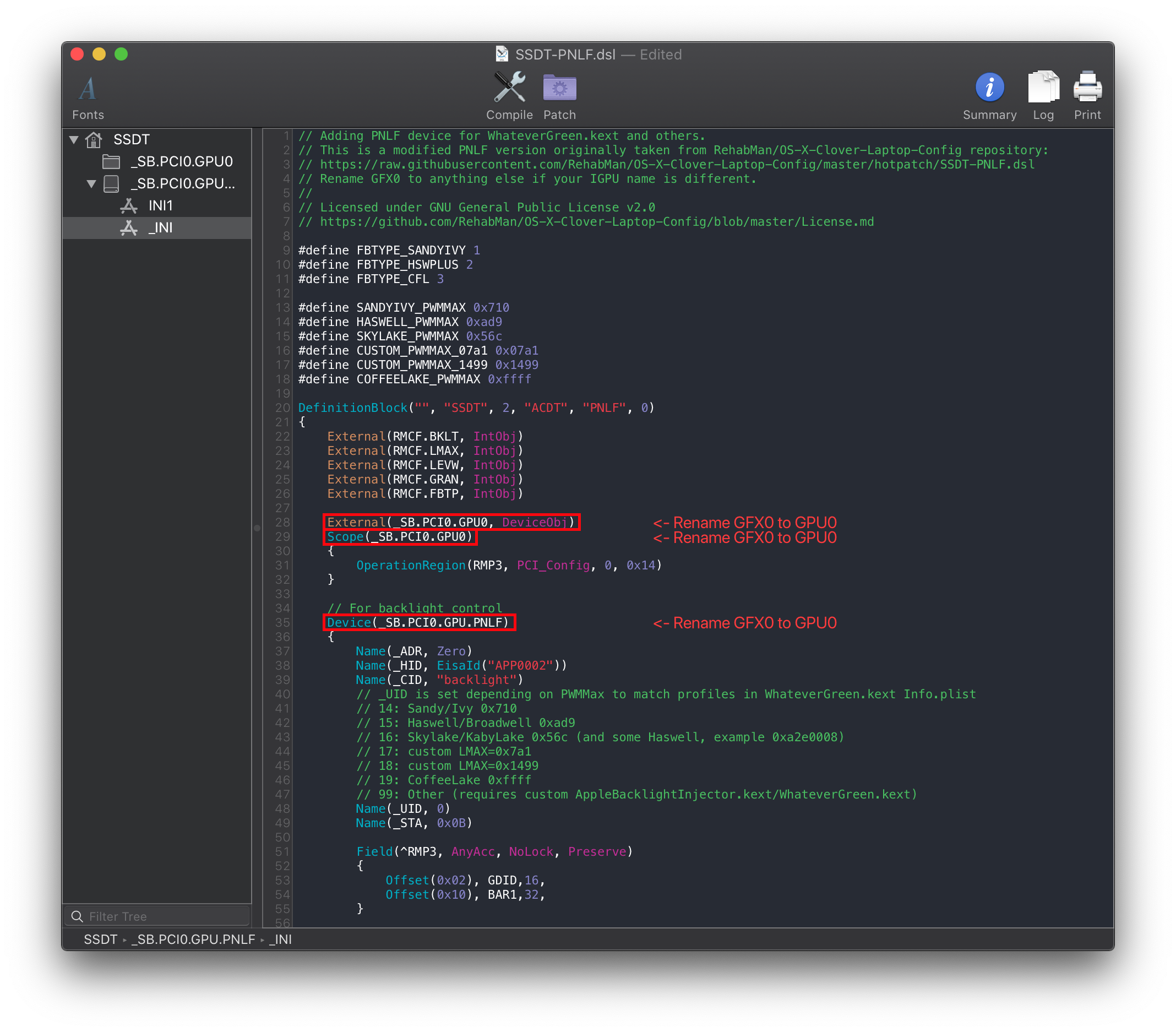 By default, this uses \_SB.PCI0.GFX0 for the pathing. you'll want to rename accordingly. For this example, we'll assume your pathing is \_SB.PCI0.GPU0: