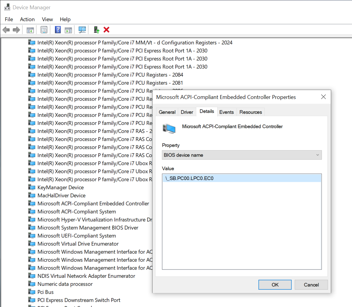 Start by opening up Device Manager in Windows and looking for a device named Embedded Controller. Once found, click on it and select the BIOS device Name entry. You should get something like this: