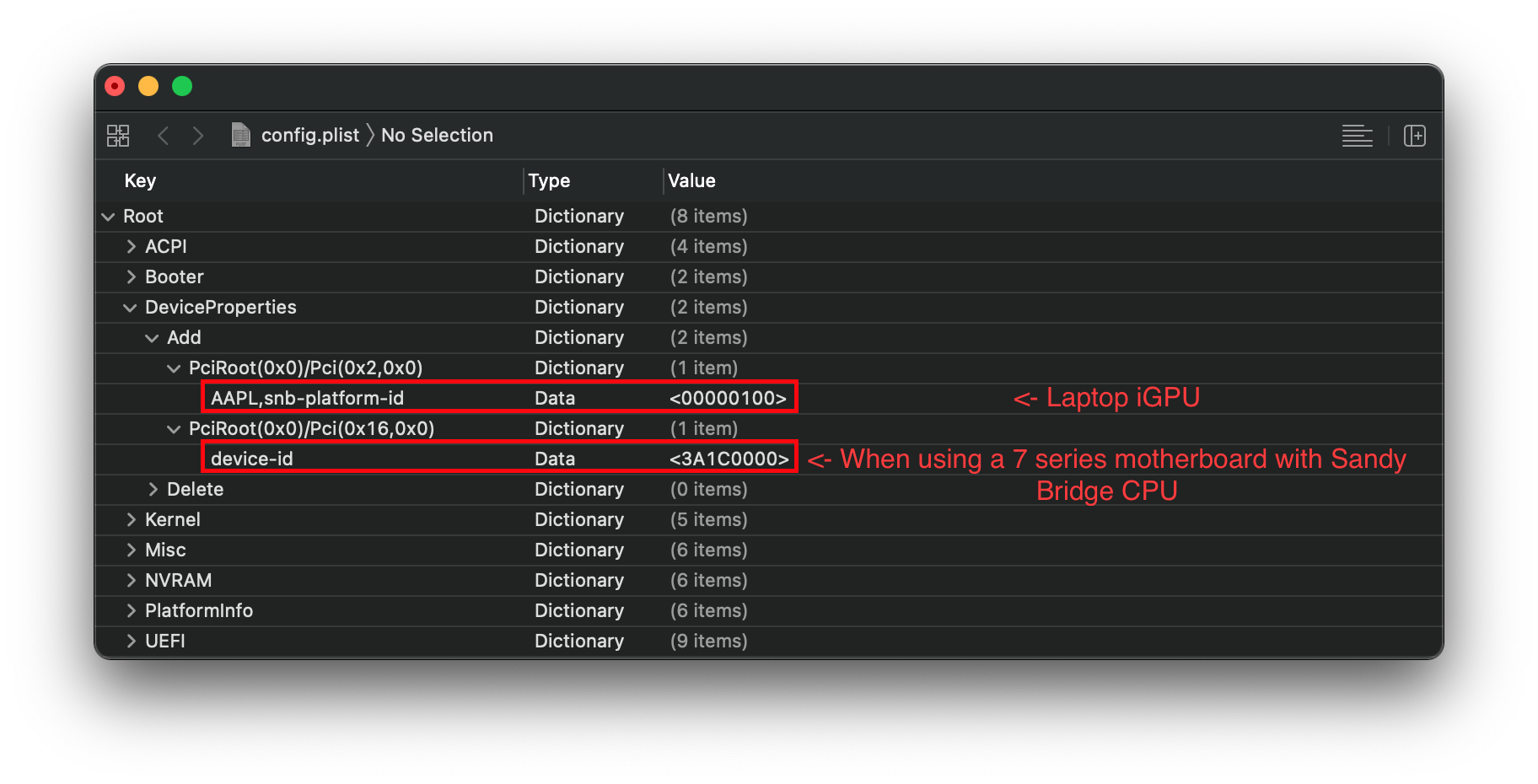 - When initially setting up your config.plist, only set AAPL,snb-platform-id - this is normally enough
