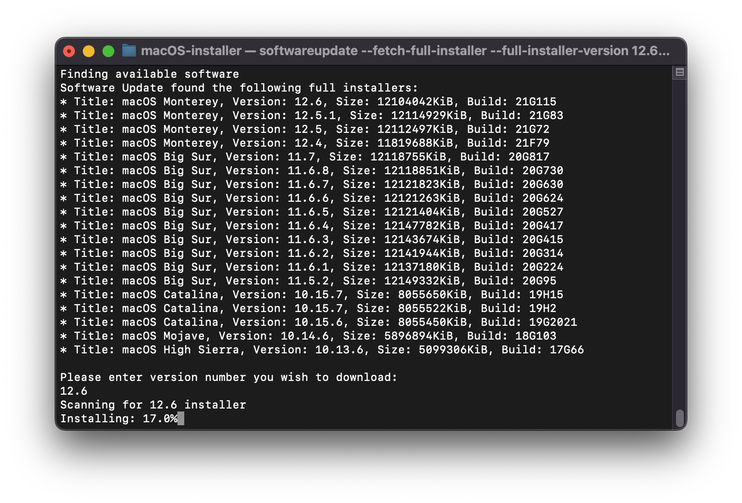 mkdir -p ~/macOS-installer && cd ~/macOS-installer && curl https://raw.githubusercontent.com/munki/macadmin-scripts/main/installinstallmacos.py > installinstallmacos.py && sudo python installinstallmacos.py