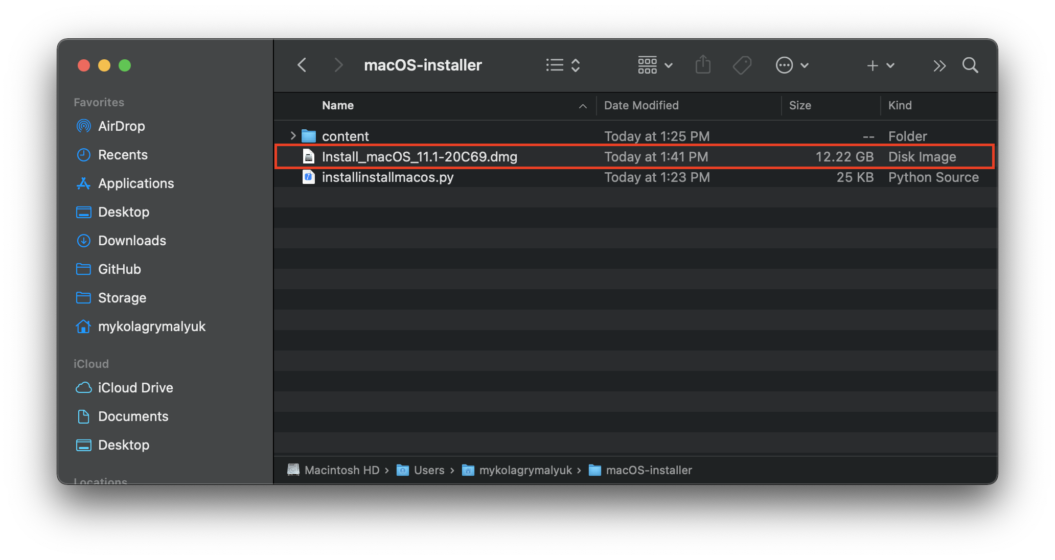 完成后,您会在~/macOS-Installer/文件夹中发现一个包含macOS安装程序的DMG。这里以名为Install_macOS_11.1-20C69.dmg的安装程序为例。挂载它,您将找到安装应用程序。