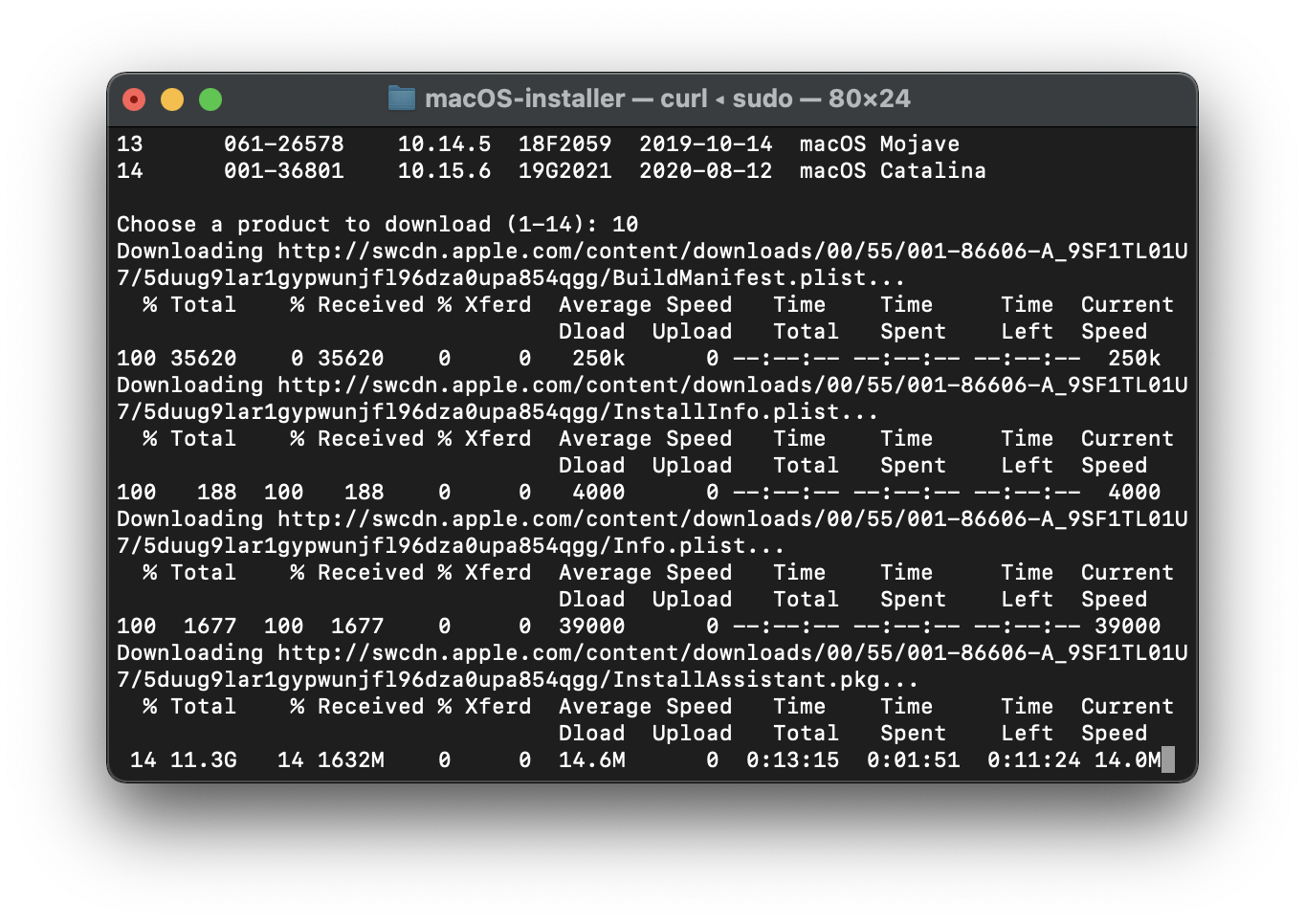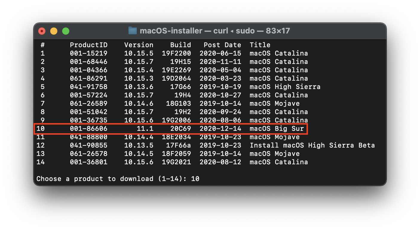 正如你所看到的,我们得到了一个很好的macOS安装程序列表。如果你需要一个特定版本的macOS,你可以通过输入旁边的数字来选择它。在这个例子中,我们选择10: