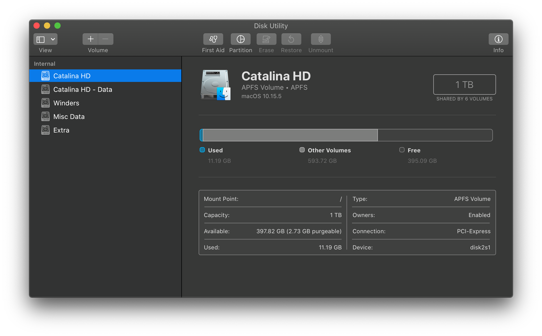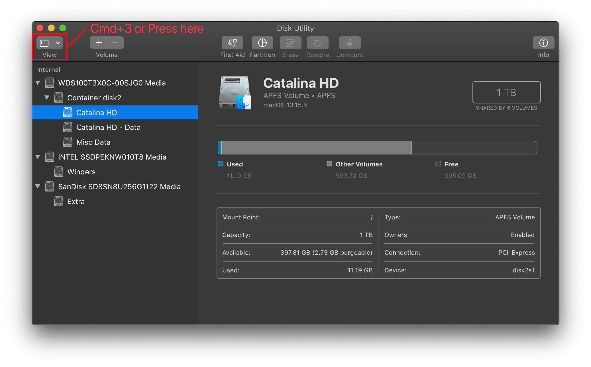 - Note by default Disk Utility only shows partitions, press Cmd/Win+2 to show all devices(Alternatively you can press the view button)