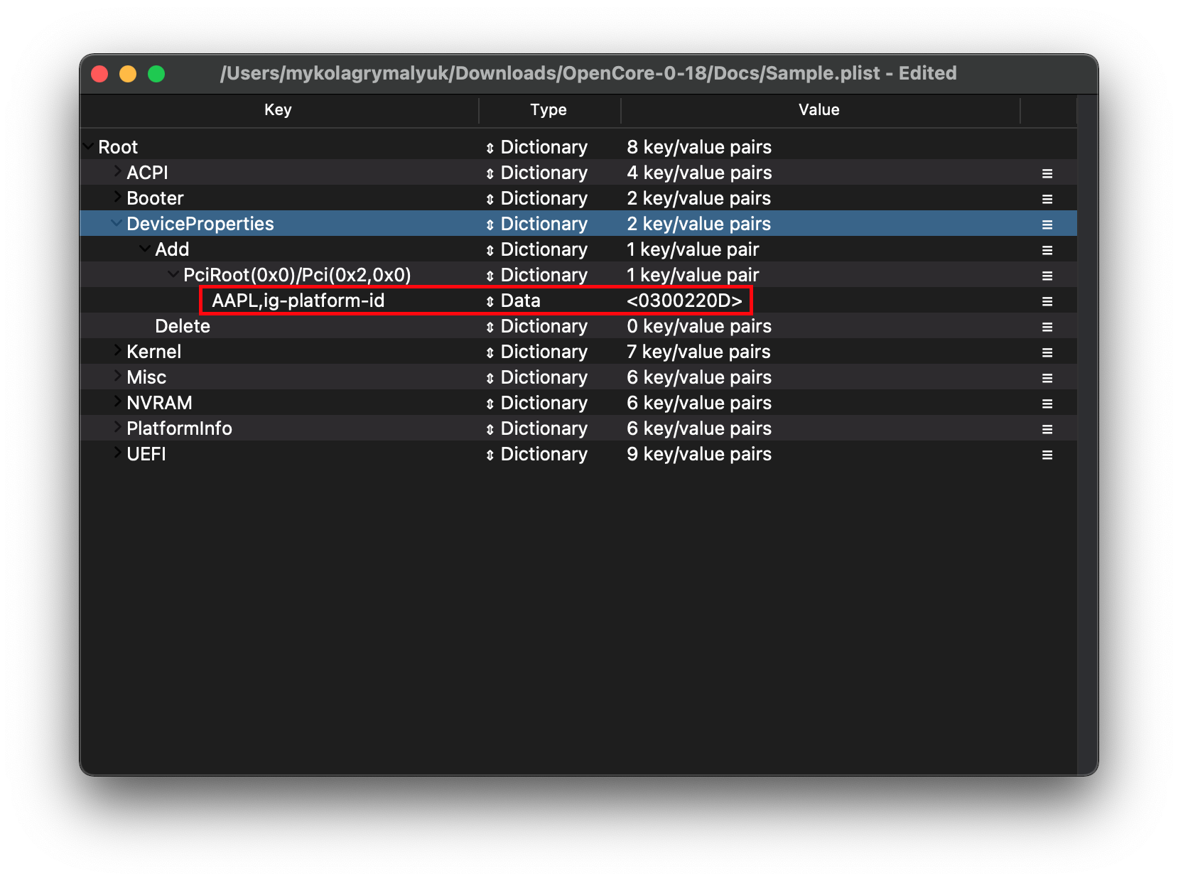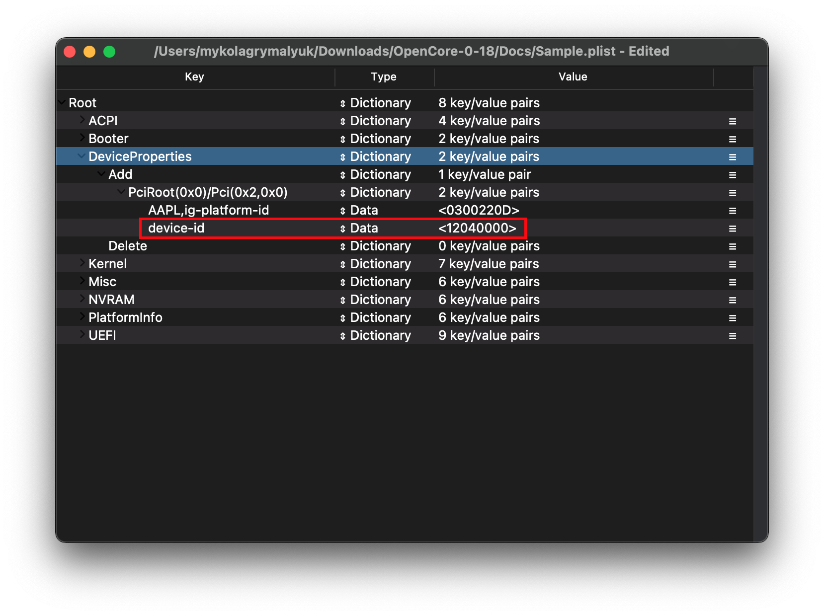 Now that we have our device-id, we'll do the same thing as before with ig-platform-id. Open your config.plist and add this new entry under PciRoot(0x0)/Pci(0x2,0x0):