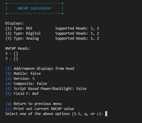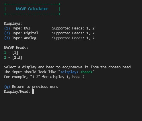 Once you are done setting up the displays, press q to return to the other NVCAP settings. You should set the rest of the NVCAP settings as follows: