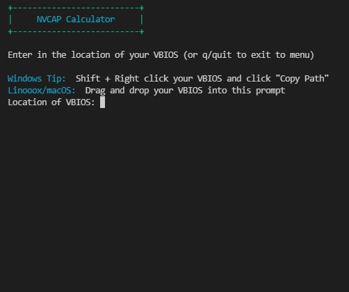 To use this program, simply grab your VBIOS(TechPowerUp hosts most VBIOS (opens new window)) and run NVCAP-Calculator within your terminal.