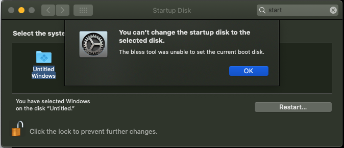 OCB: StartImage failed - Already started - Windows Startup Disk can't see APFS drives