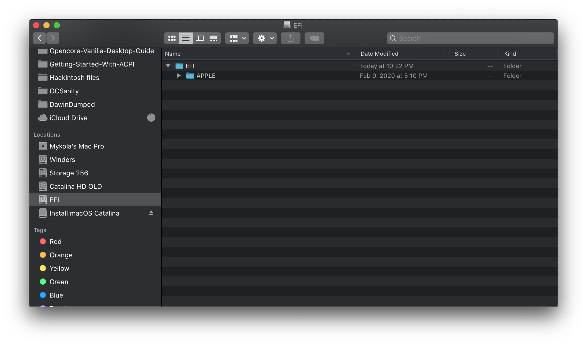 当你挂载主驱动器的EFI时,你可能会看到一个名为“APPLE”的文件夹,这是用于更新真实mac上的固件,但对我们的硬件没有影响。您可以擦除EFI分区上的所有内容,并将其替换为USB上的分区