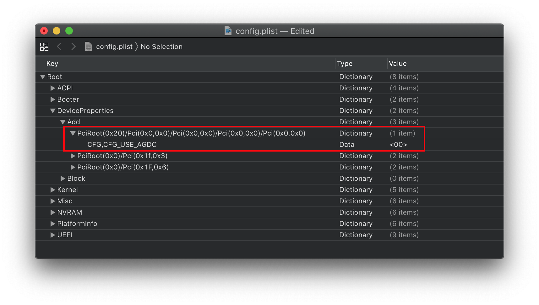 CFG,CFG_USE_AGDC | Data | 00- You can find the PciRoot of your GPU with gfxutil (opens new window)