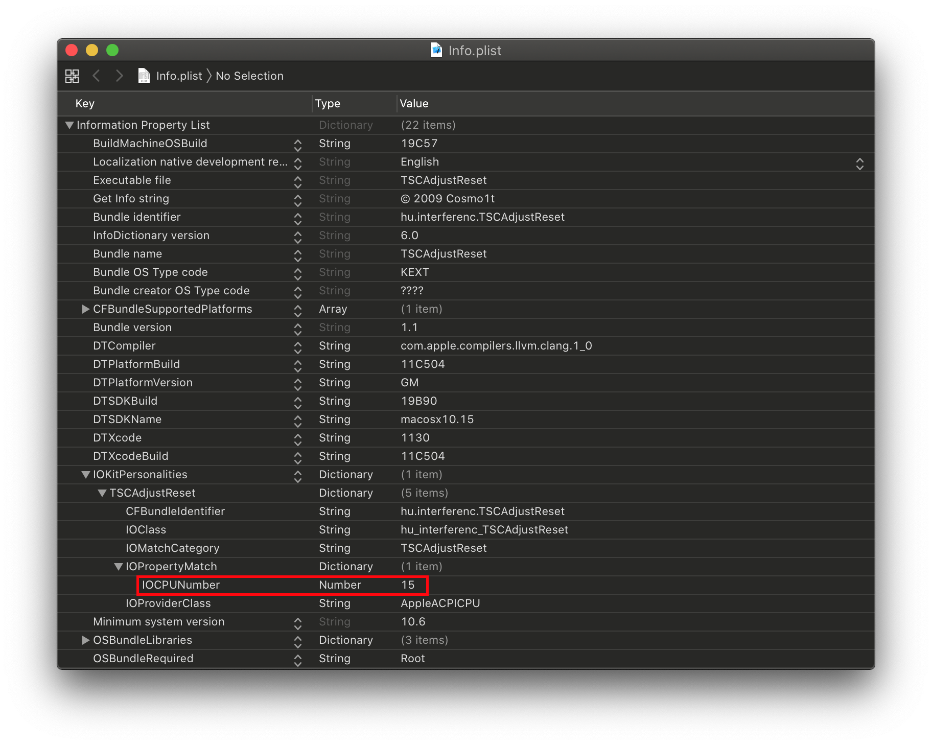 Contents -> Info.plist) and change the Info.plist ->IOKitPersonalities -> IOPropertyMatch -> IOCPUNumberto the number of CPU threads you have starting from0(i9 7980xe 18 core would be35as it has 36 threads total) - Compiled version can be found here: TSCAdjustReset.kext (opens new window)