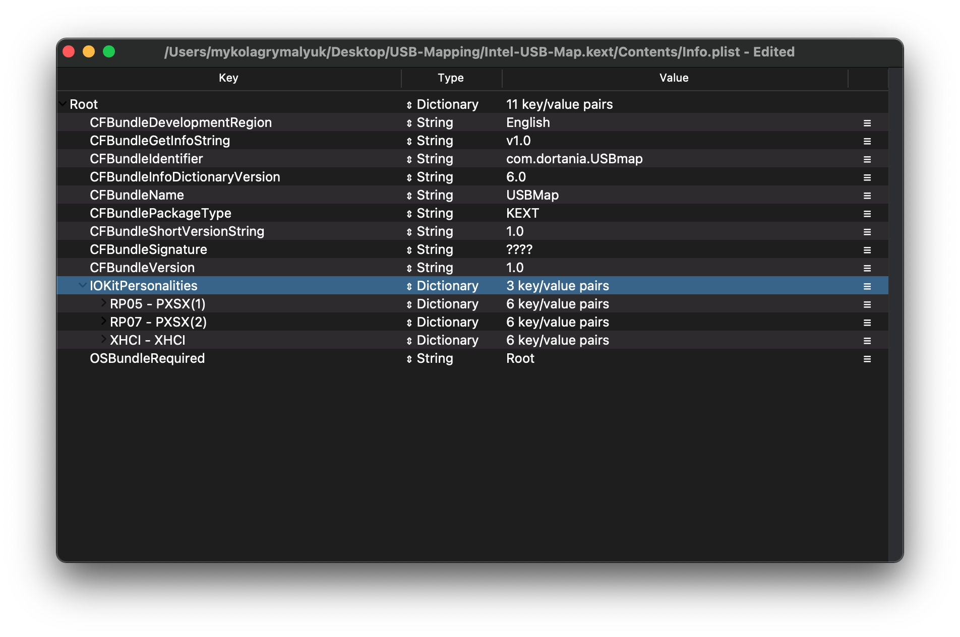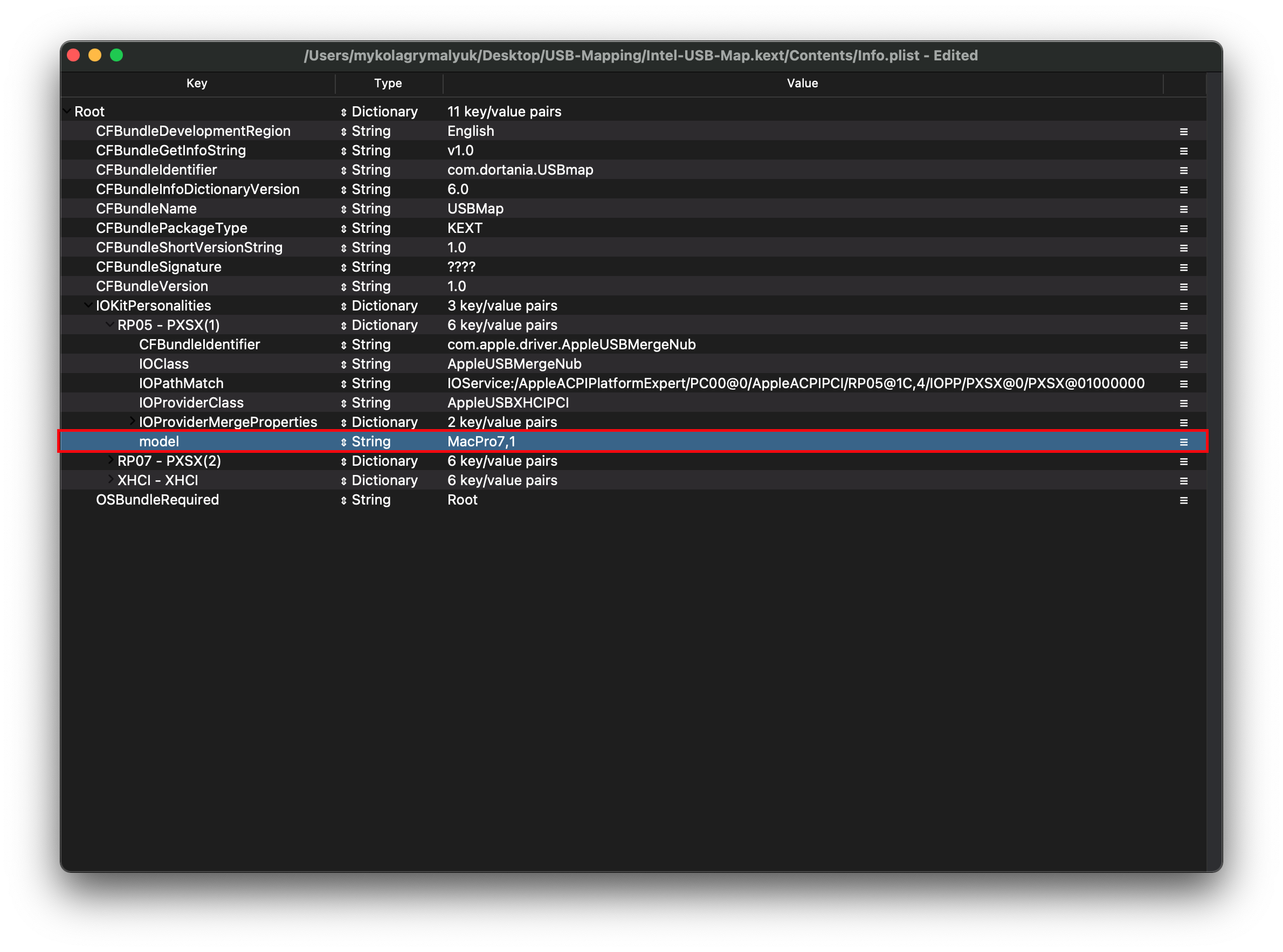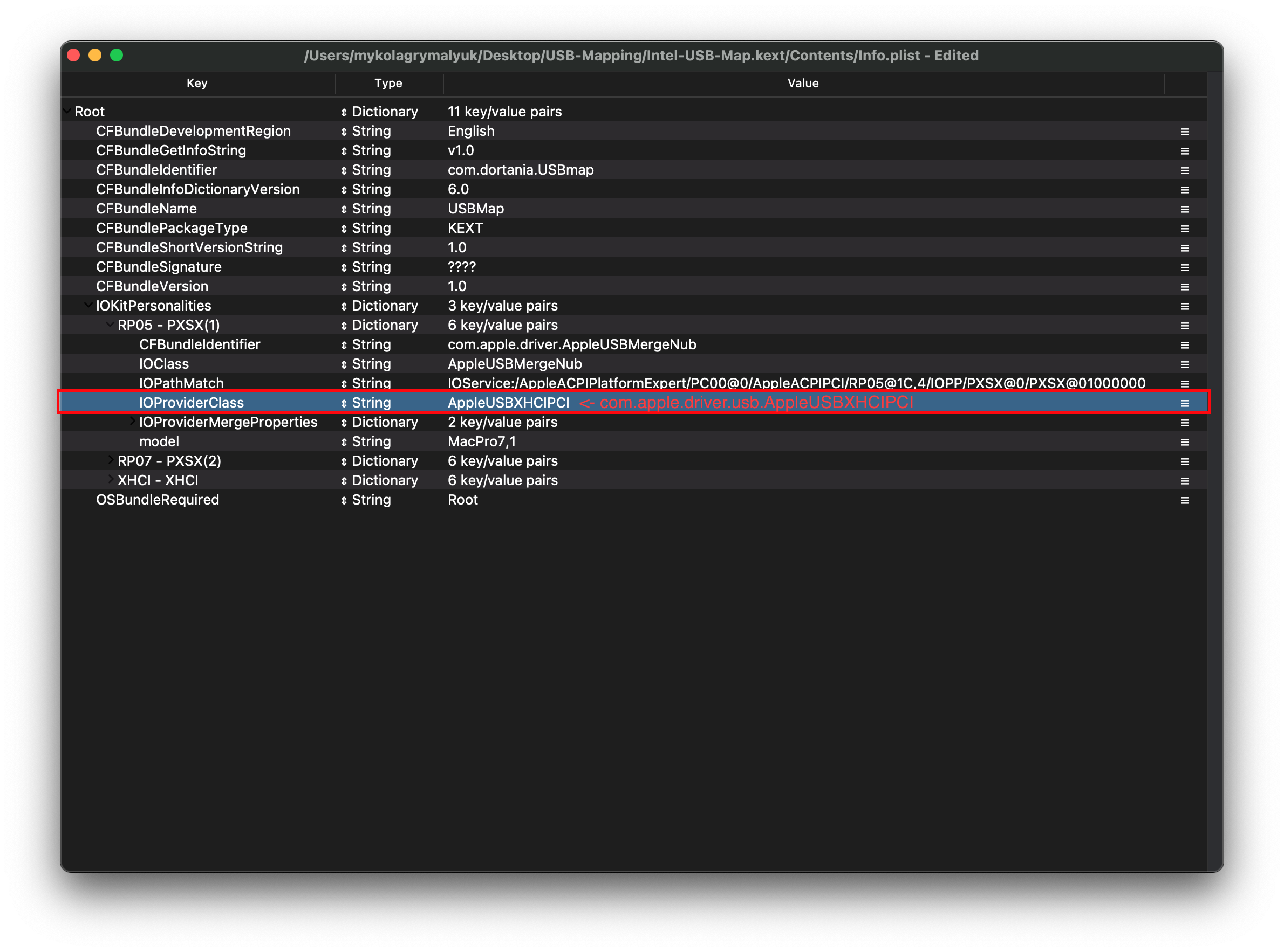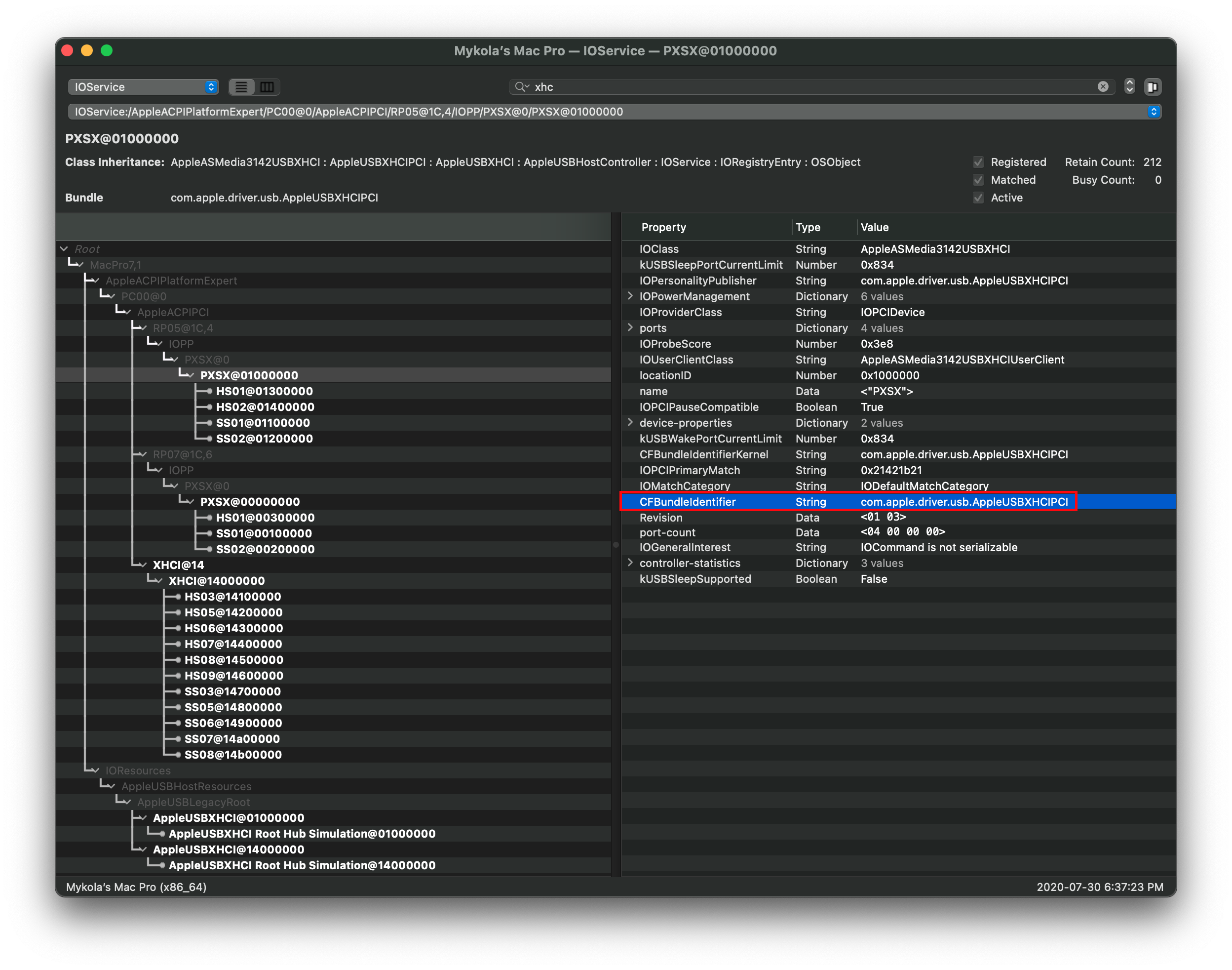 Finding IOProviderClass is also easy, select the Root-hub once again and look for the CFBundleIdentifier value: