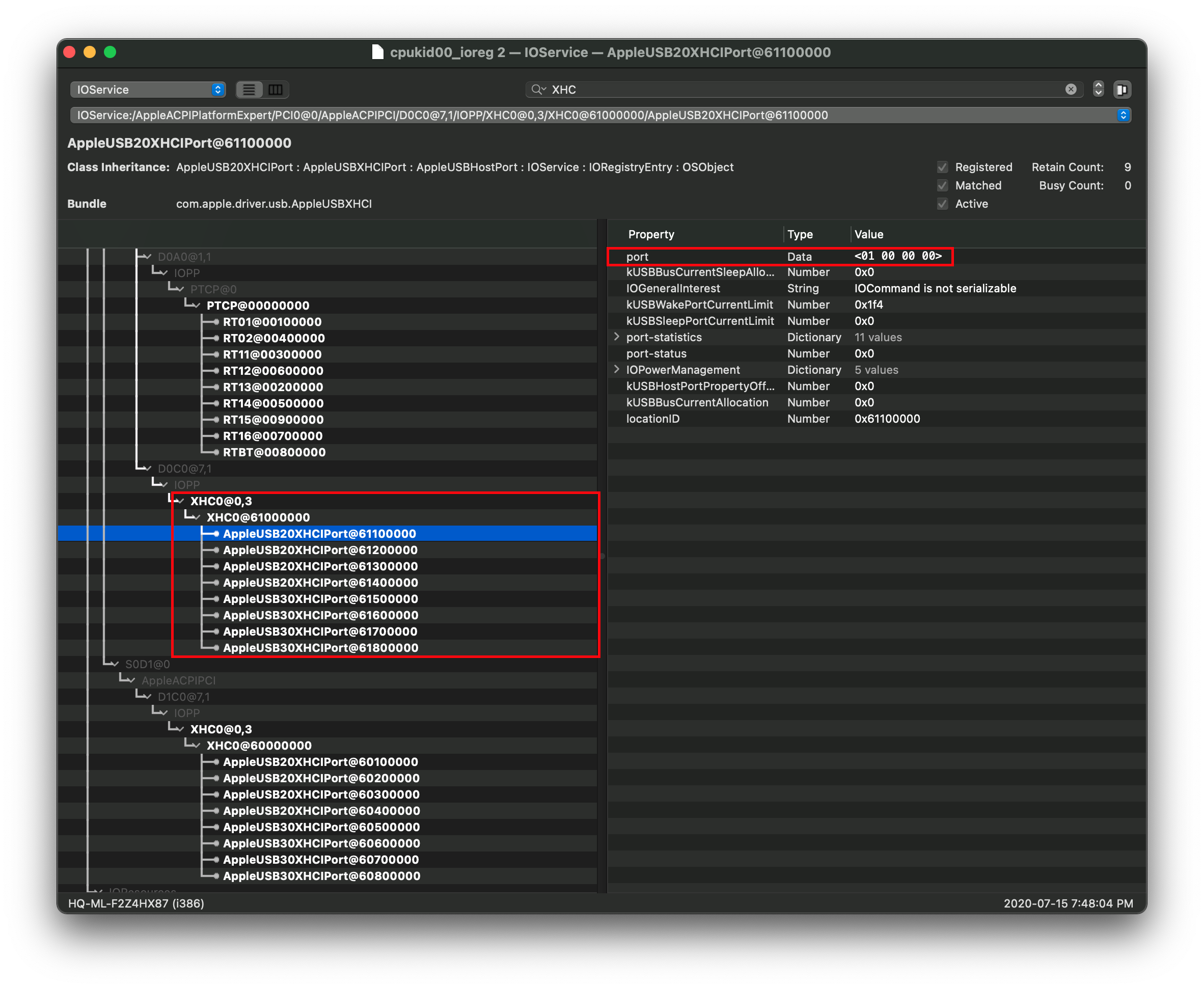 Note: If your USB ports show up as either AppleUSB20XHCIPort or AppleUSB30XHCIPort, you can still map however it will be a bit more difficult. Instead of writing down the names, pay very close attention to the port property on the right hand side: