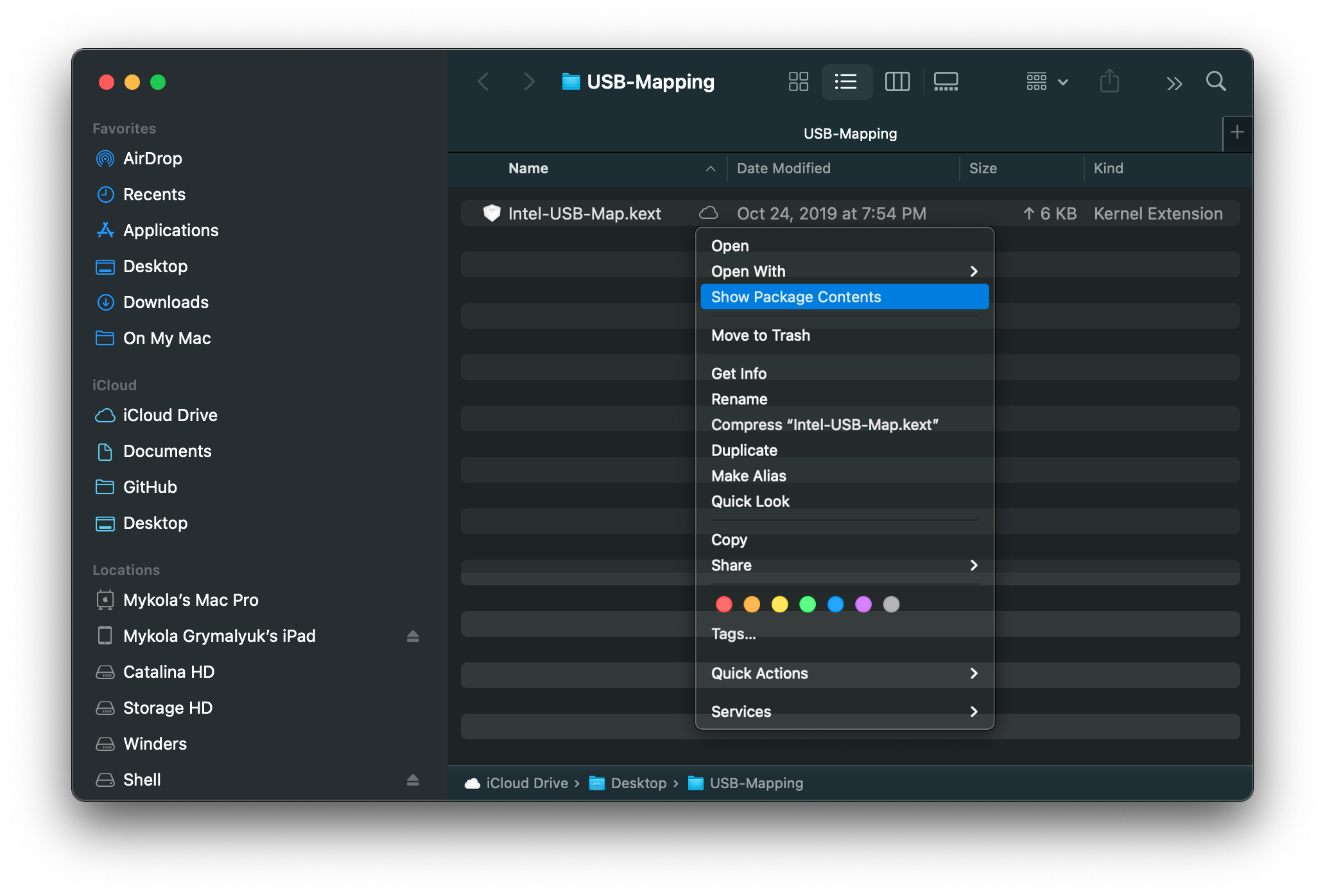 Next right click the .kext, and select Show Package Contents. then drill down to the info.plist: