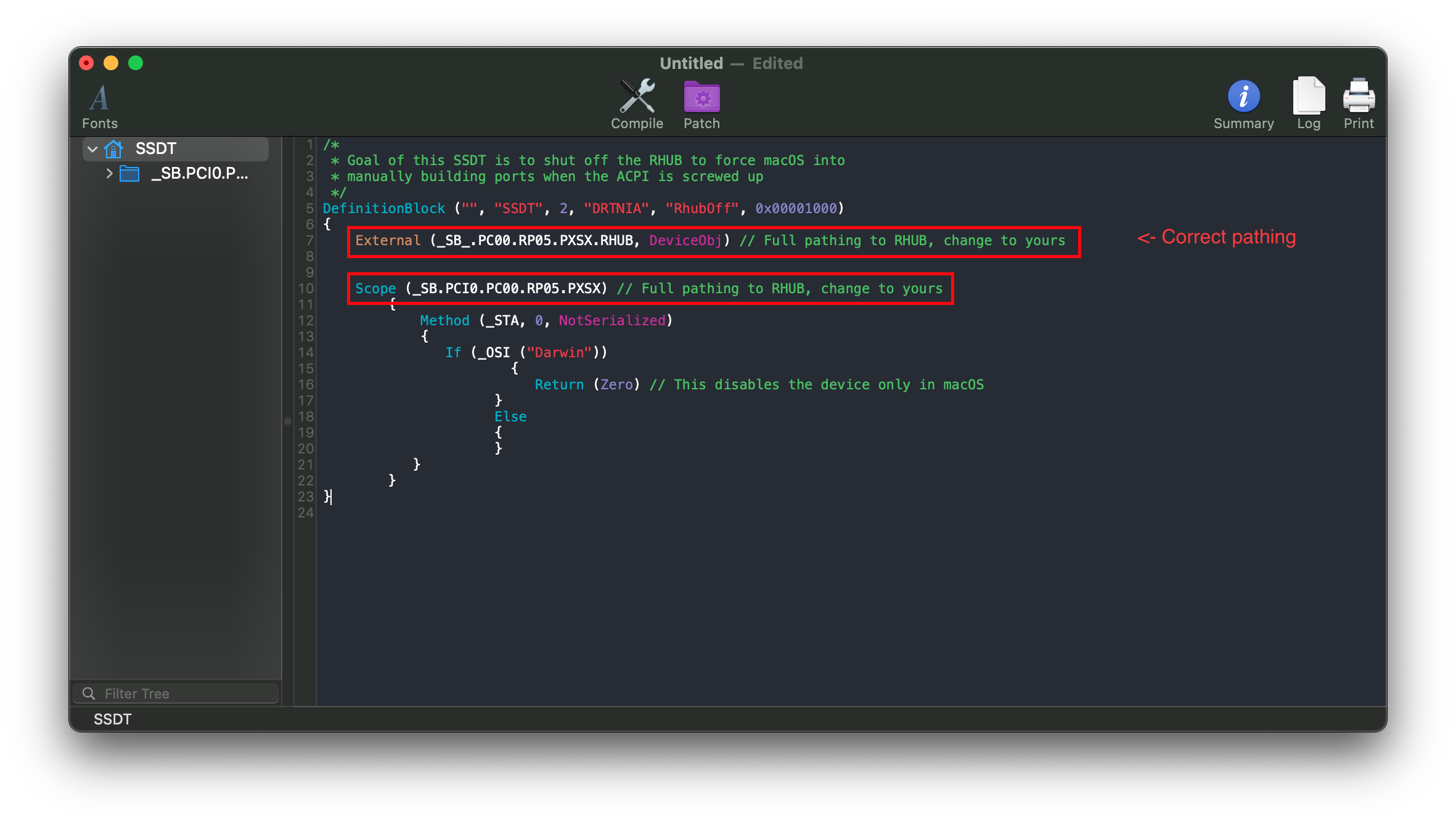 Following the example from above, we'll be renaming PCI0.XHC1.RHUB to PC00.RP05.PXSX.RHUB: