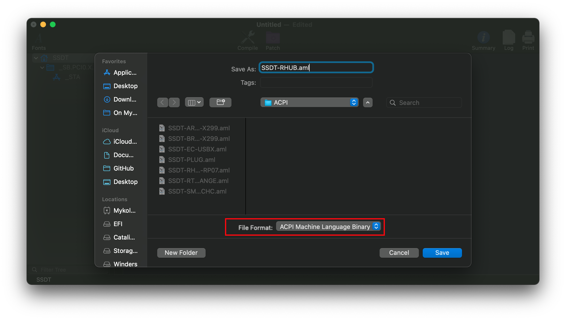 Once you've edited the SSDT to your USB controller's path, you can export it with File -> SaveAs -> ACPI Machine Language Binary: